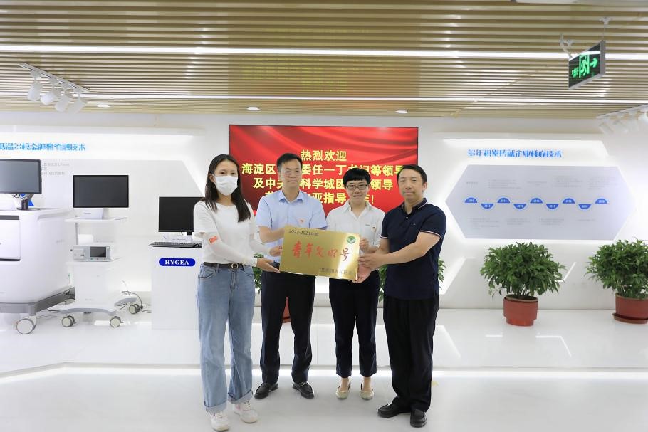 2022年7月8日上午,海淀區(qū)團(tuán)區(qū)委副書記任一丁等領(lǐng)導(dǎo)來到海杰亞醫(yī)療進(jìn)行青年志愿服務(wù)隊授旗暨海淀區(qū)青年文明號授牌儀式。